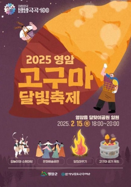 영암 고구마 달빛축제는 전라남도 영암군이 지역 특산물인 고구마를 주제로 정월대보름에 개최하는 특별한 행사입니다. 2025년 2월 15일 토요일 저녁 6시부터 8시까지 영암읍 달맞이공원 일대에서 진행된 이번 축제는 한겨울 달빛 아래에서 고구마와 전통문화를 함께 즐길 수 있는 다채로운 프로그램으로 구성되었습니다.